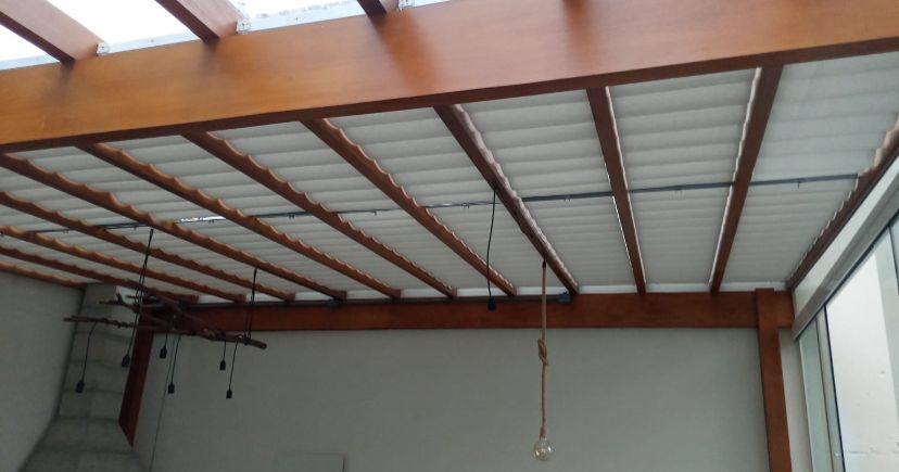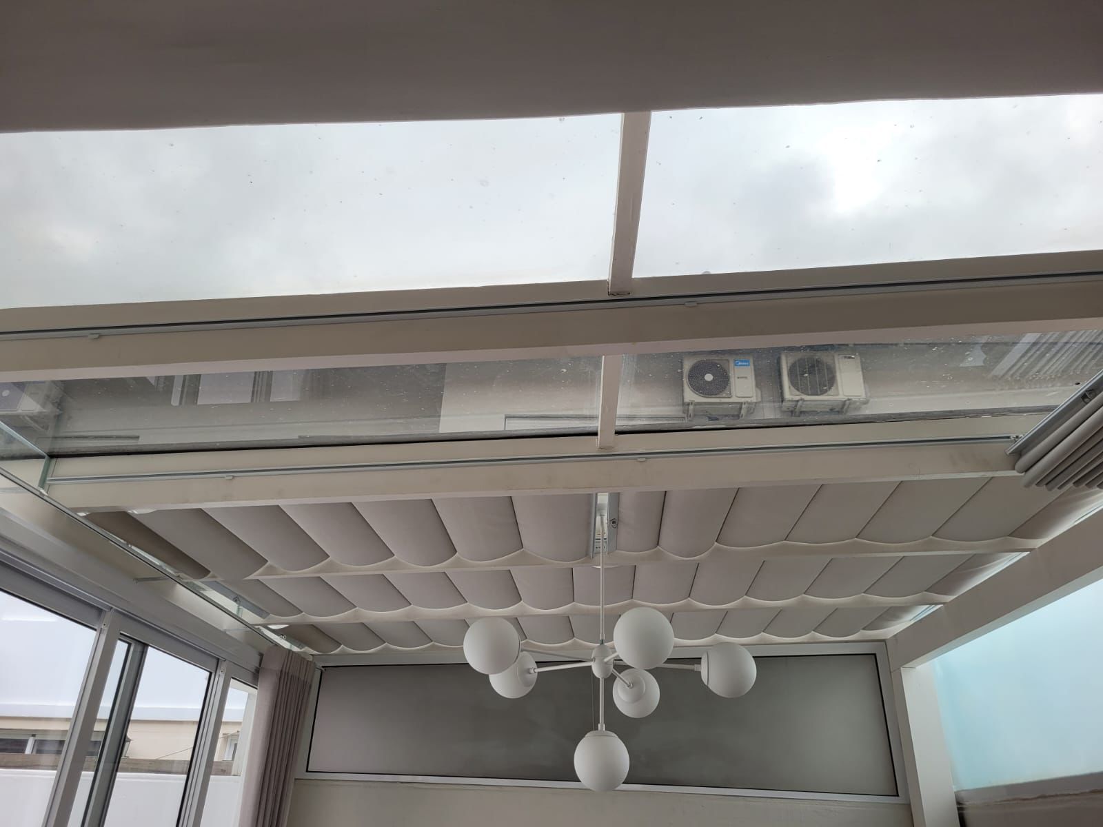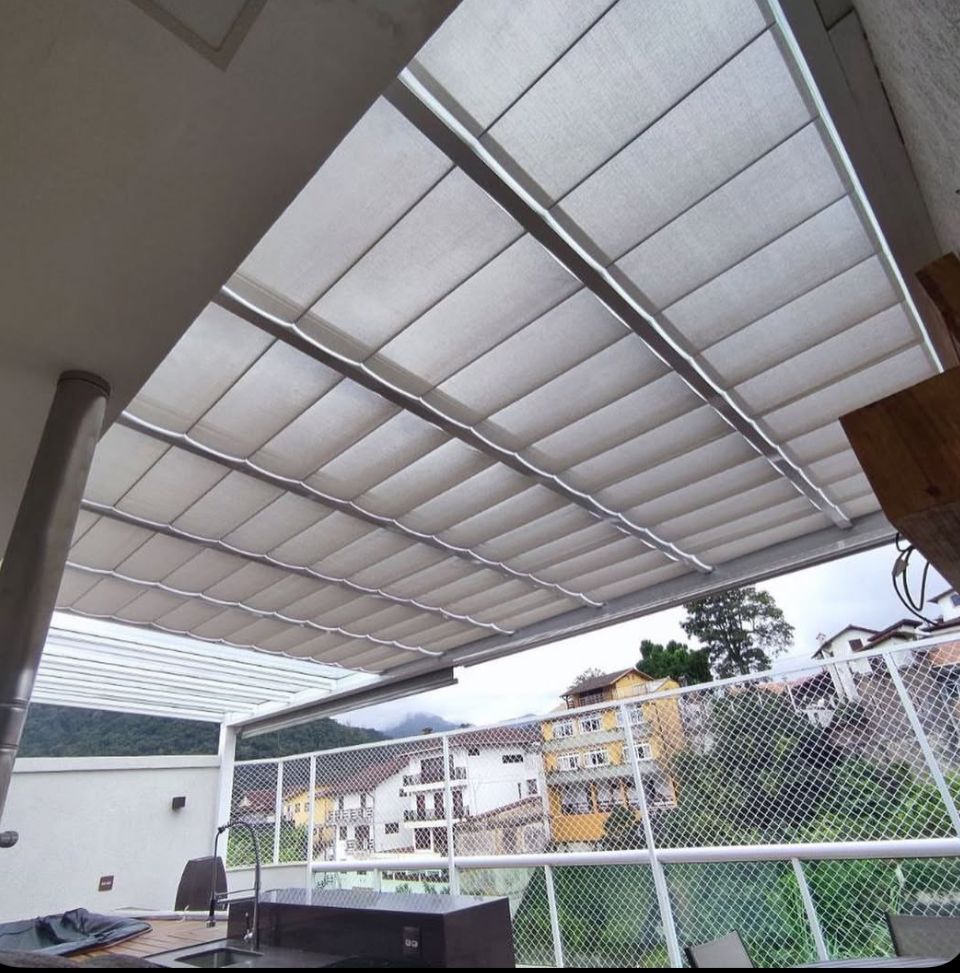 A Cortina Romana de Teto é uma solução para o aproveitamento de áreas externas cobertas por vidros ou policarbonato. Reduz a intensidade da luz e bloqueia os raios UV. Ideal quando confeccionada